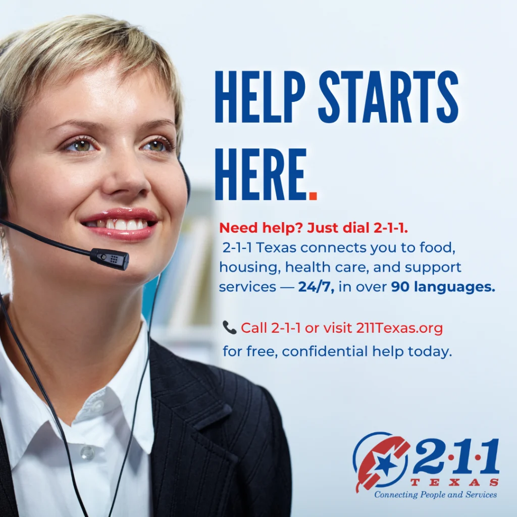 Whether you need help finding a food pantry, financial assistance, home accessibility, emergency food, or paying utility bills, 2-1-1 Texas provides you with resource specialists who can offer community support.